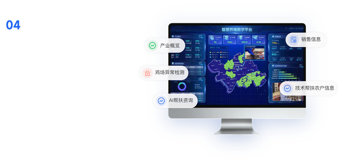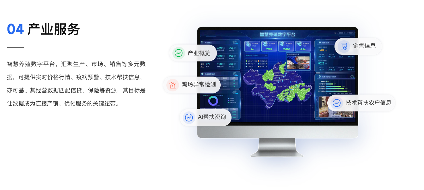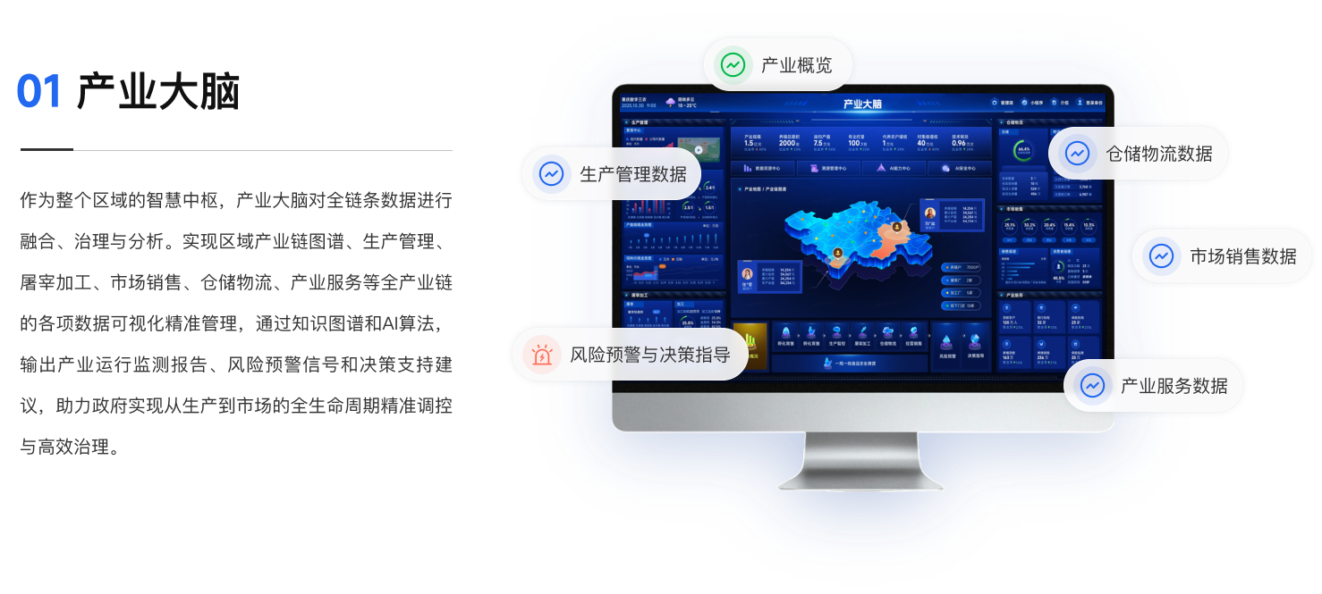一屏统揽全域养殖态势,实现精准监管、风险预警与产业协同智慧,提升治理效能,汇聚全产业链数据,构建产业大脑,赋能政府精准监管、科学规划和高效服务产业链发展。